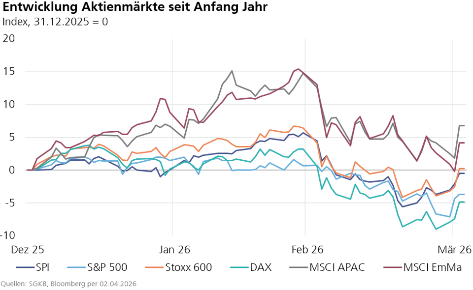 Die Aktienmärkte reagieren im Moment sehr sensibel auf die Bewegungen des Ölpreises. Seit Kriegsbeginn haben die massgebenden Leitindizes zum Teil erhebliche Korrekturen verzeichnet. Durch den positiven Jahresstart halten sich die Kursrückgänge insgesamt in Grenzen.