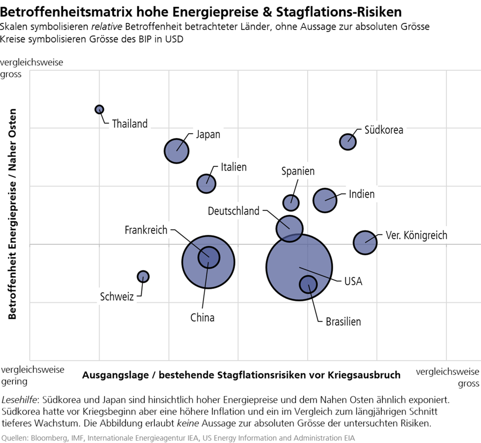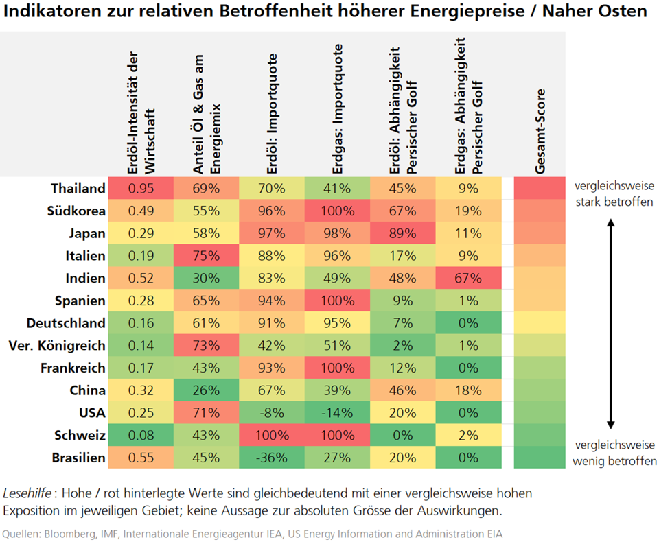 Der Vergleich entsprechender Zahlen zeigt, dass asiatische Länder wie Südkorea, Japan oder Indien deutlich stärker exponiert sind als andere Volkswirtschaften. Grund dafür sind deren hohe Abhängigkeiten von Öl- und Gasimporten allgemein und spezifisch von solchen aus dem Nahen Osten. Auch europäische Staaten, inklusive der Schweiz, beziehen beträchtliche Mengen an Öl und Erdgas aus dem Ausland und sind damit von den höheren Preisen betroffen. Der Nahe Osten spielt als Zulieferregion aber eine geringere Rolle. Aus Sicht der Weltwirtschaft positiv ist die im Vergleich mit anderen Ländern moderate Exposition der USA und China. Während die USA ein Netto-Exporteur von Öl- und Erdgas sind, produziert China immer noch einen wesentlichen Teil seiner Energie aus Kohle.