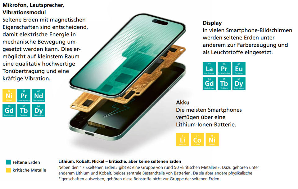 Yttrium, Dysprosium oder Promethium: Die 17 als «seltene Erden» geltenden Metalle haben kryptische Namen und sind im Bereich moderner Technologien unersetzbar. Sie können starke Magnetfelder aufbauen, hohen Temperaturen widerstehen oder präzise Lichtimpulse erzeugen. Nur dank dieser Eigenschaften ist die Entwicklung sparsamer Elektromotoren, effizienter Windturbinen oder leistungsstarker Chips überhaupt möglich. Aber auch im Display, im Mikrofon und im Vibrationsmodul eines handelsüblichen Smartphones stecken bis zu elf verschiedene seltene Erden.