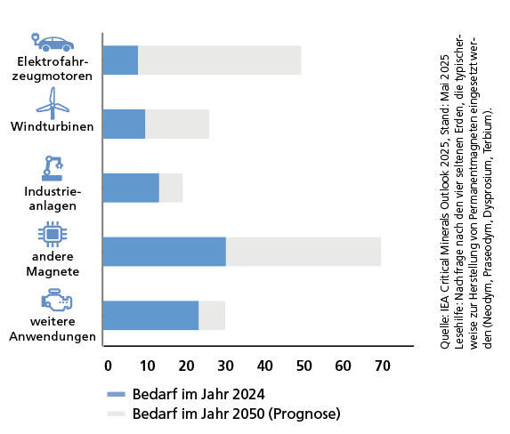 Der Bedarf an seltenen Erden ist bereits heute gross. Getrieben von den Megatrends Automation, Digitalisierung und Dekarbonisierung, wird die Nachfrage in den nächsten Jahrzehnten nochmals erheblich steigen. Dies zeigt sich beispielhaft am jährlichen Bedarf der vier seltenen Erden, die für die Herstellung von Permanentmagneten eingesetzt werden. Dieser wird sich gemäss Schätzungen der Internationalen Energieagentur bis 2050 mehr als verdoppeln. Ein zentraler Wachstumsfaktor ist dabei der Einsatz in Motoren für Elektrofahrzeuge. Die Abhängigkeiten von einer stabilen Versorgung mit seltenen Erden werden weiter zunehmen und damit auch die Abhängigkeit von China.