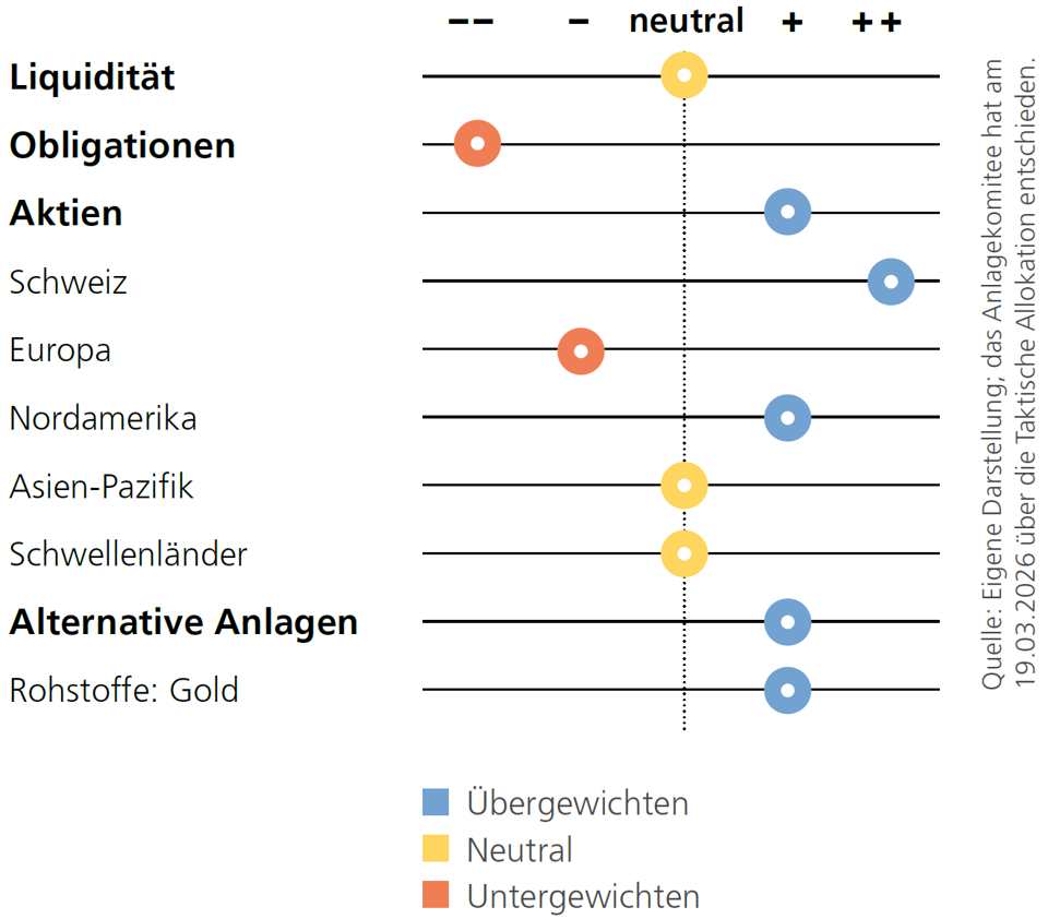 Risikoanlagen stehen derzeit unter Druck, ohne dass sich die fundamentalen Wachstumsaussichten signifikant verschlechtert haben. Die weitere Entwicklung im Iran-Krieg und ihr Einfluss auf den Erdölpreis müssen eng beobachtet werden. Vor diesem Hintergrund halten wir an unserer taktischen Positionierung fest. Aktien bleiben übergewichtet, mit einem Fokus auf den defensiveren Schweizer Markt sowie auf US-Aktien. Europäische Aktien bleiben untergewichtet, während wir Schwellenländer und die Region Asien-Pazifik neutral gewichten. Obligationen bleiben aufgrund tiefer Schweizer Zinsen untergewichtet, erfüllen jedoch zusammen mit Gold und Liquidität weiterhin eine wichtige Stabilisierungsfunktion im Portfolio.