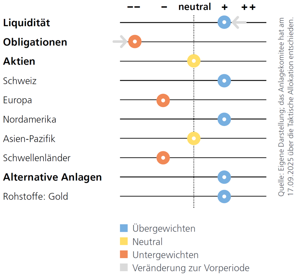 Im aktuellen Umfeld ist und bleibt Diversifikation das oberste Gebot. Auf Ebene der Aktien halten wir an einer neutralen Gewichtung fest. Regional bevorzugen wir weiterhin den defensiven Schweizer Markt, der dank tiefer Zinsen und moderater Bewertungen die im Quervergleich attraktivste Risikoprämie bietet. Auch in den übrigen Regionen bleiben die Allokationen unverändert: US-Aktien werden übergewichtet, Europa und Schwellenländer hingegen untergewichtet. Die erhöhte Liquidität wird leicht reduziert und im Gegenzug die Obligationenquote leicht erhöht. Diese verbleibt aber immer noch deutlich unter der strategischen Zielallokation. In Kombination mit der Goldposition bleibt das Portfolio breit abgestützt.