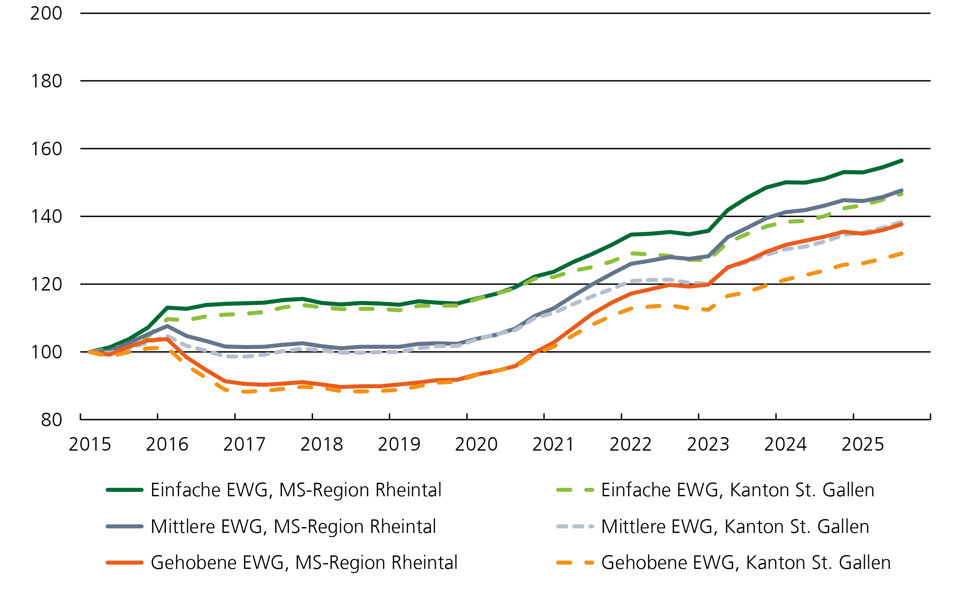 Im 3. Quartal 2025 setzten die Preise für Eigentumswohnungen im Rheintal ihren dynamischen Aufwärtstrend fort und stiegen gegenüber dem Vorjahresquartal um 3.2 Prozent an. Einfamilienhäuser im mittleren Segment verteuerten sich im gleichen Zeitraum 1.9 Prozent, womit sich der Preisauftrieb im Vergleich zu den vorangegangenen Quartalen abgeschwächt hat. Beide Wachstumsraten liegen unter den landesweiten Werten von 4.5 Prozent respektive 4.6 Prozent.