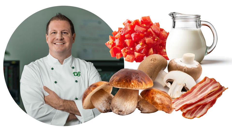 - Die Pilzmasse mit den gehackten Tomaten ablöschen und weitere 5 Minuten köcheln lassen. Dann Rahm und den Speck dazugeben.