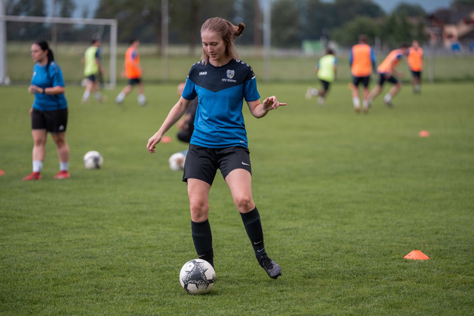 Dass Winona Berweger leidenschaftlich Fussball spielt, ist längst kein Bankgeheimnis mehr. Beim Thema Fussballerinnen fällt ihr Name auffallend oft. Kein Wunder: Die junge Kundenberaterin aus Diepoldsau steht als Verteidigerin für die erste Frauenmannschaft des FC Widnau auf dem Platz. Es ist Dienstagabend, 19 Uhr, Winona steht auf dem Spielfeld – bereit, alles zu geben. Als Innenverteidigerin beim Frauenteam des FC Widnau ist sie die letzte Bastion vor dem Tor. «Da fühle ich mich am sichersten», sagt sie. «Ich habe den Überblick und kann viel steuern.» Grosse Verantwortung? «Habe ich nie so gesehen», meint sie mit einem Schulterzucken. Fussball war bei ihr Familiensache. «Ich habe meiner Schwester einfach alles nachgemacht, auch das mit dem Fussball», sagt sie und lächelt. Die Schwester hat später aufgehört, Winona blieb. 2012 begann sie bei den Juniorinnen des FC Staad, absolvierte dort vier intensive Jahre. Dann kam die Lehre bei der St.Galler Kantonalbank, der Fussball rückte in den Hintergrund. «Meine Ausbildung war mir wichtiger. Profifussball war nie ein Thema», stellt sie nüchtern fest.