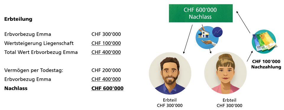 Gemäss Gesetz würde nun der Nachlass zum gleichen Teil an die Kinder gehen. Emma und Ben stünden je 300’000 Franken zu. Emma hat jedoch durch den Erbvorbezug bereits 400’000 Franken bekommen und müsste 100’000 Franken in den Nachlass einbringen, das heisst gegenüber Ben zur Ausgleichung bringen.