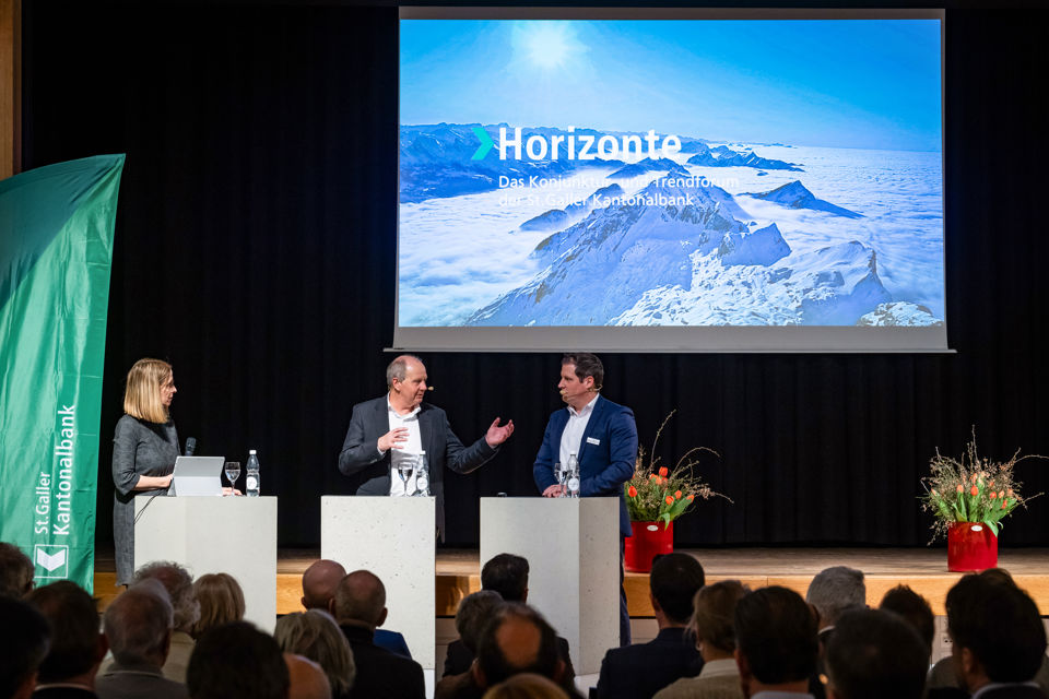 Der Experte Stefan Bratzel zeigte am Trend- und Konjunkturforum auf, welche Transformation der Automobilindustrie bevorsteht. Die Ökonomen der SGKB präsentierten die Aussichten für die Ostschweizer Wirtschaft und diskutierten diese mit einem Vertreter der Regierung.